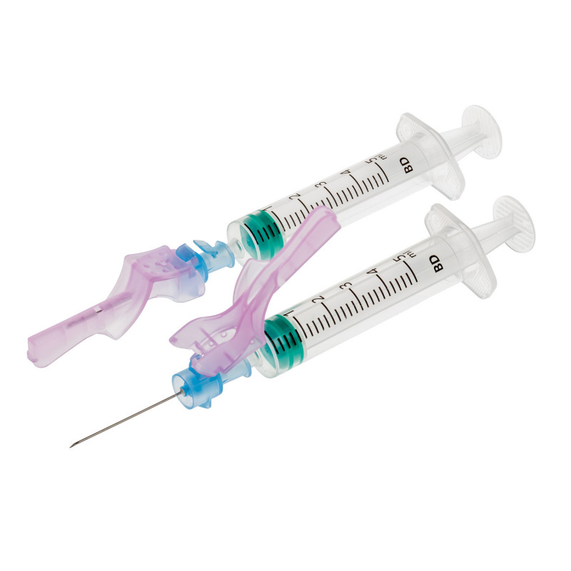 Safety needle with proprietary BD SmartSlip Technology has a connector clip on the hub to enable safe use with Luer-slip syringes. Recommended for intramuscular injections for adult patients and suitable for intravenous injection and venipuncture.