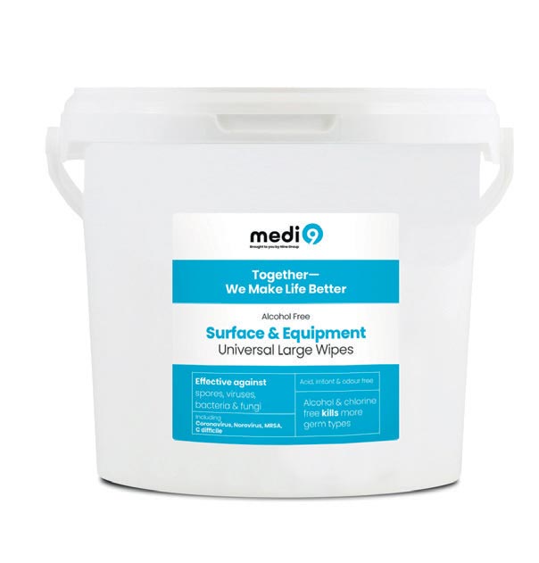 Each wipe is impregnated with Medi9 biocide-technology sanitising solution, disinfecting surfaces in seconds. Effective against 99.9% of bacteria, spores, viruses and fungi, obviating the need to stock a range of products for use with different pathogens, reducing costs and making effective infection control simple.